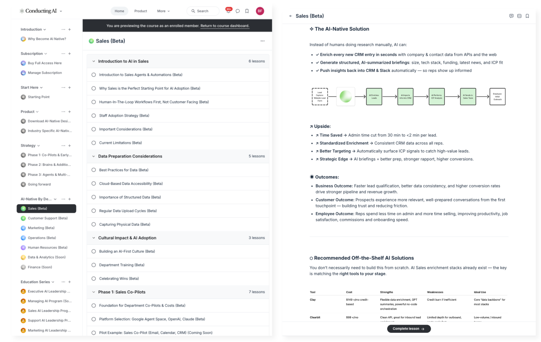 Conducting AI maps your business, shows where AI fits, and provides a three-phase AI-Native Company Design. You’ll receive a structured FigJam blueprint plus linked AI workflows for each department, giving you clarity on how to sequence your transformation.